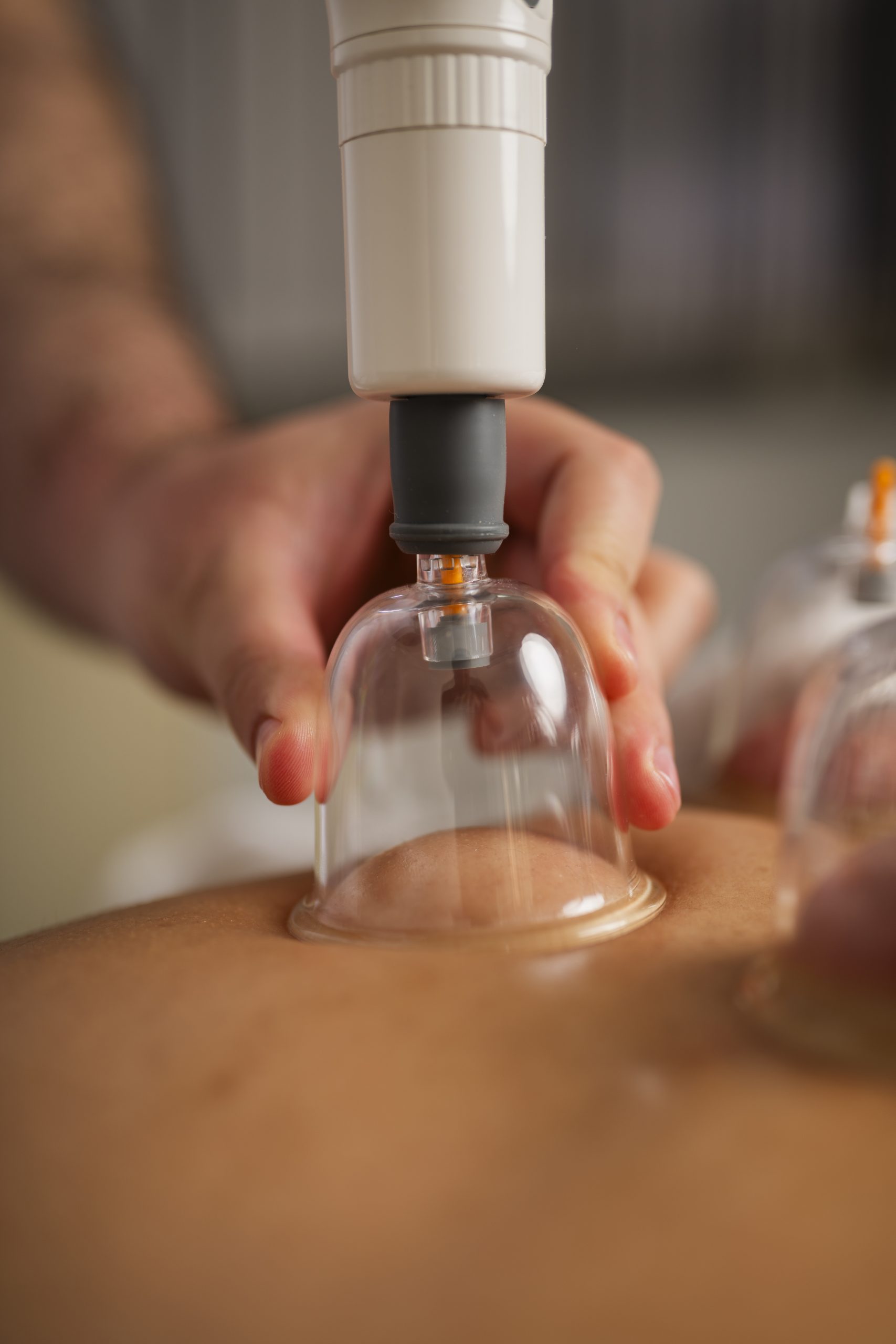 Beim Schröpfen werden Gläser auf die Haut gesetzt, um durch Unterdruck die Durchblutung anzuregen und Verspannungen zu lösen.